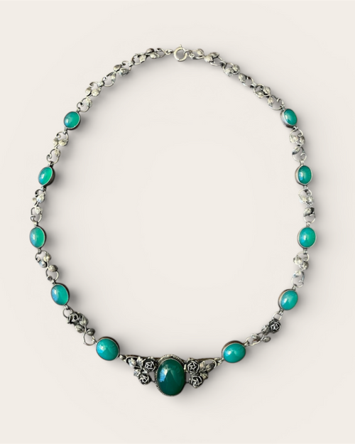 Etruscan-style Silver tone Necklace with Green Glass Cabochons